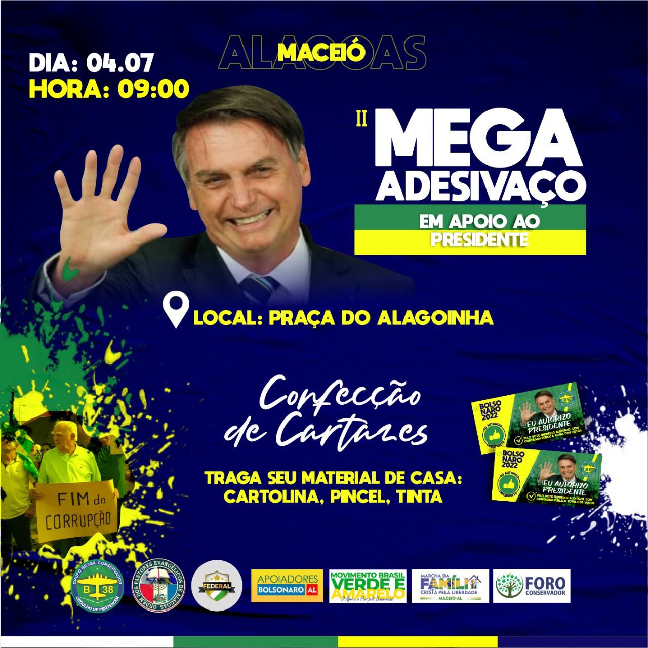 Participarão alguns movimentos em apoio ao Presidente Bolsonaro em Alagoas: Apoiadores de Bolsonaro em Alagoas, B38, Agentes Federais do Brasil, Marcha da Família entre outros.