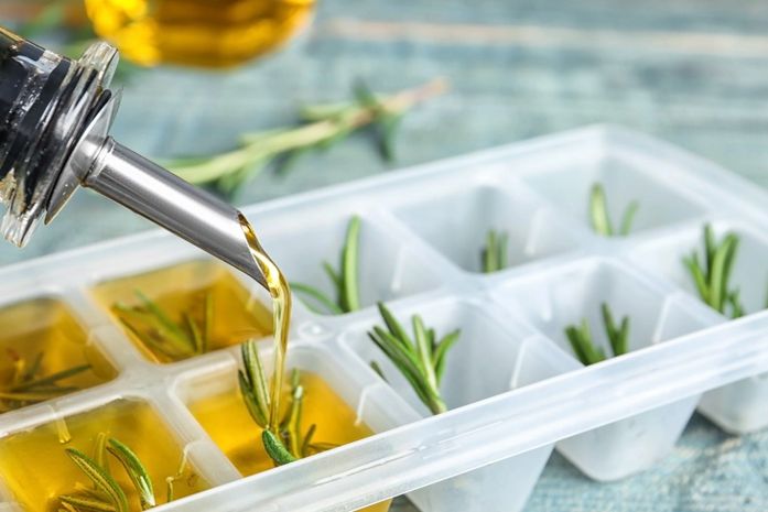 Colocar em bandejas de cubos de gelo (cerca de 2/3 cheio de ervas);