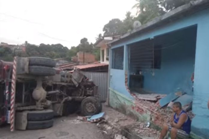 Um caminhão carregado com areia tombou e atingiu duas residências, na tarde desta quinta-feira (23), em uma rua da Grota da Alegria, no bairro Benedito Bentes, parte alta de Maceió. Além das casas, uma motocicleta também foi atingida. Ninguém se feriu.