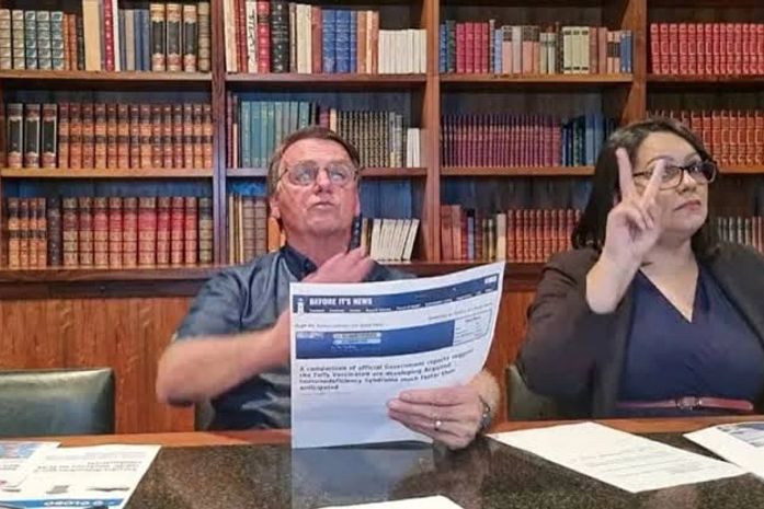 Na live, o presidente leu uma notícia falsa que dizia que “vacinados [contra a Covid] estão desenvolvendo a síndrome da imunodeficiência adquirida [Aids]”.