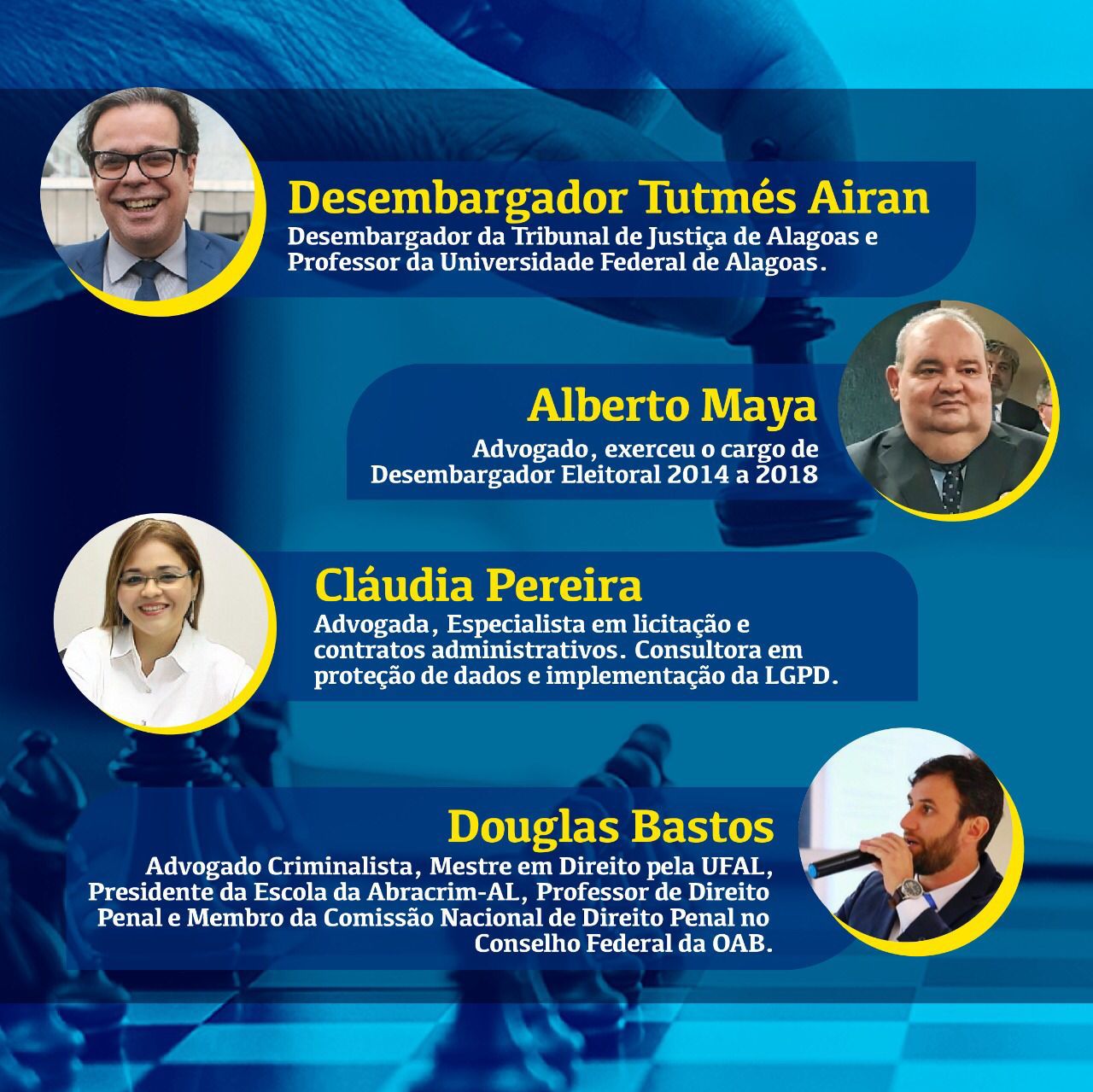 Conheça os palestrantes: Tutmés Airan é desembargador do Tribunal de Justiça de Alagoas e professor da Ufal; Alberto Maya é advogado e foi desembargador eleitoral; Cláudia Pereira é professora do Cesmac, advogada especialista em licitações e contratos administrativos, além de consultora em proteção de dados e implementação da LGPD; Douglas Bastos é advogado e mestre em Direito Público pela Universidade Federal de Alagoas; bem como Presidente da Escola da Associação Brasileira dos Advogados Criminalistas (ABRACRIM-AL), professor de Direito Penal e membro da Comissão Nacional de Direito Penal no Conselho Federal da OAB;