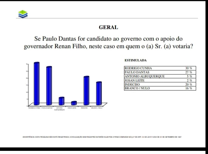 O resultado mostrou o seguinte cenário: Rodrigo Cunha (PSDB-AL) , com 30%, Paulo Dantas (MDB-AL) com 27%, Antônio Albuquerque com 5% e Josan Leite com 2%. Indeciso 20% e 16% de branco e nulo.