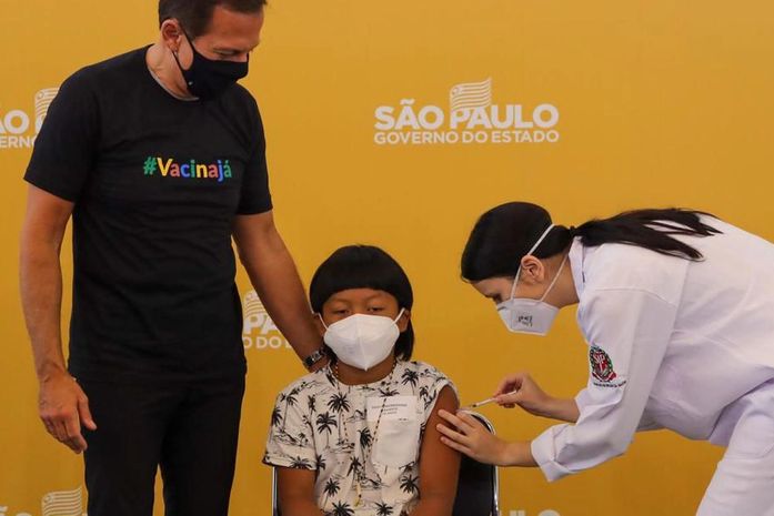O menino Davi, um indígena xavante de 8 anos que mora em Piracicaba, no interior do estado de São Paulo, é a primeira criança na faixa de 5 a 11 anos de idade a ser vacinada no país. Ele recebeu a dose em uma cerimônia simbólica no início da tarde de hoje (14) no Hospital das Clínicas de São Paulo, com a presença do governador de São Paulo, João Doria.
