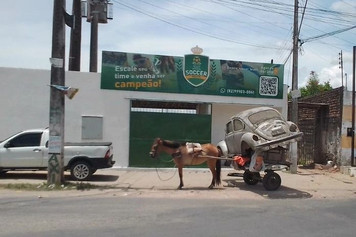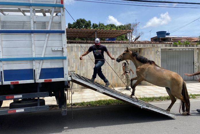 Populares viram o homem transportando a carcaça de um veículo na carroça, que estava sendo puxada por uma égua. Equipes da Unidade de Vigilância e Zoonose (UVZ) da Secretaria Municipal de Saúde (SMS) também estiveram no local e constataram que o animal apresentava lesões nas patas e cascos traseiros.