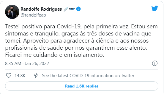 O vice-presidente da Comissão Parlamentar de Inquérito (CPI) da Covid-19, o senador Randolfe Rodrigues (Rede-AP) publicou nas redes sociais na terça-feira (25) que testou positivo para a doença pela primeira vez. Informou que está sem sintomas e "tranquilo" em função de ter tomado as duas doses da vacina, além da dose de reforço.