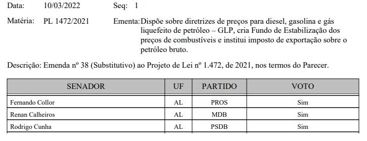 Na votação, os três parlamentares que representam Alagoas no Senado, Fernando Collor (PROS), Rodrigo Cunha (PSDB) e Renan Calheiros (MDB), foram favoráveis ao PL.