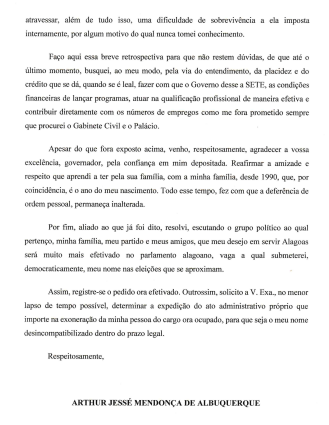 ”Superados os efeitos de ordem financeira que afetaram o Estado, organizadas as constas, negociadas as dívidas, feitos os empréstimos, ainda assim, a Secretaria de Trabalho e Emprego de Alagoas, como nenhuma outra, precisou de muita resiliência para atravessar, além de tudo isso, uma dificuldade de sobrevivência a ela imposta internamente, por algum motivo do qual, nunca tomei conhecimento", diz Albuquerque em trecho da carta.
