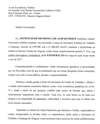 Mais uma baixa no governo Renan Filho. O secretário Estadual do Trabalho e Emprego, Arhur Albuquerque, pediu exoneração do cargo, em caráter “irrevogável e irretratável”, nesta quarta-feira (23). O filho de deputado Antônio Albuquerque, que estava no comando da pasta desde 2017, anunciou sua saída em carta endereçada ao governador.