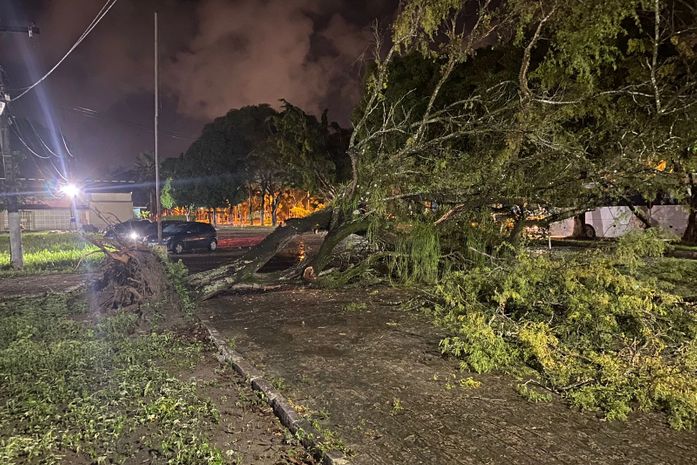 A árvore caiu em cima de uma motocicleta que estava estacionada no local. O proprietário do veículo acionou o serviço de seguro. Felizmente, ninguém se feriu.