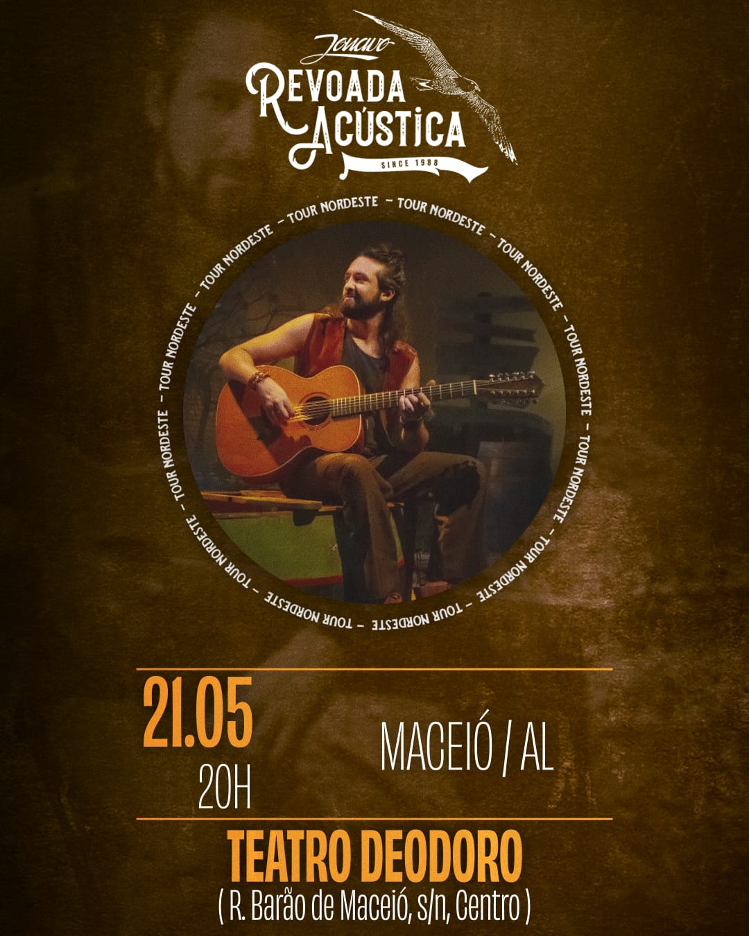 O cantor e compositor Jonavo anuncia um show exclusivo da turnê “Revoada Acústica”, em Maceió no dia 21 de Maio, no Teatro Deodoro (Rua Barão de Maceió, S/Nº, Centro). O show terá a cenografia assinada pela artista visual Ana Luiza Bargham, que também é produtora (CULT VIVA) da Turnê Nordeste, além de uma participação especial, que juntos, prometem emocionar o público. Jonavo, também, realizará show gratuito na APAE (Associação de Pais e Amigos dos Excepcionais) da cidade como um ato de gratidão pelo momento da carreira.