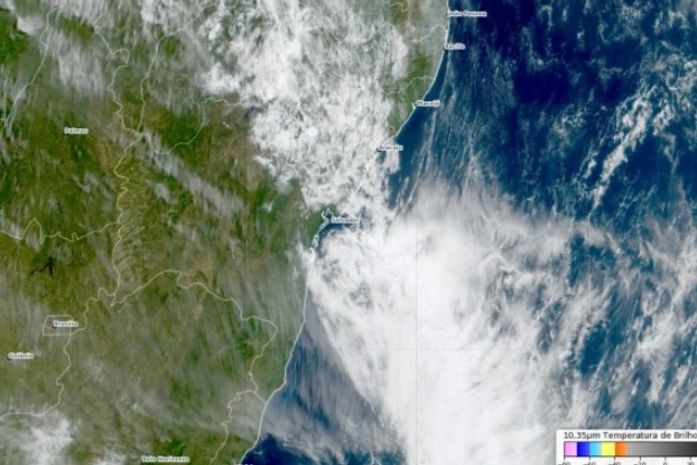 Na imagem também é possível ver uma extensa área de nebulosidade no Oceano Atlântico se aproximando do litoral alagoano.