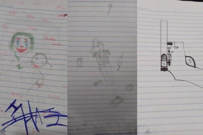 Em seu caderno foram encontrados desenhos de arma, homem matando uma mulher com uma faca e palhaços.