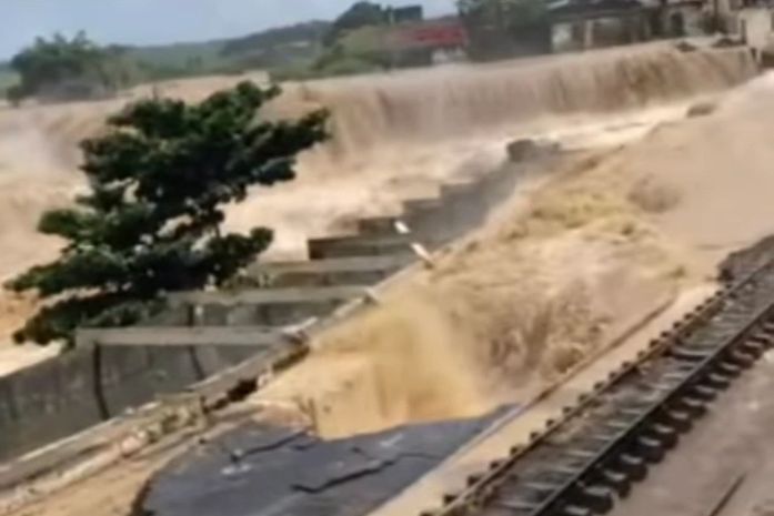 Com o nível hidrológico acima do normal, os estragos na região central da cidade se intensificaram. “A nossa preocupação é a barragem, pois quando a represa se rompe trás a insegurança para a população. Todo o comércio está assustado com os alagamentos em decorrência da barragem. Estamos fazendo todos os laudos técnicos junto a Defesa Civil e a Secretaria de Meio Ambiente da cidade para tomar todas as medidas necessárias”, declarou o prefeito Gilberto Gonçalves. Cratera foi aberta pela força da água; linha férrea ameaça ceder.