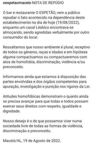 Em sua rede social, o restaurante onde o episódio aconteceu repudiou a atitude do cliente e disse que nenhuma hipótese compactua com atos de homofobia, discriminação ou violência.
