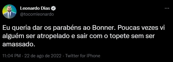 Vereador por Maceió, Leonardo Dias (PL) também ironizou a entrevista: “Eu queria dar os parabéns ao Bonner. Poucas vezes vi alguém ser atropelado e sair com o topete sem ser amassado”.