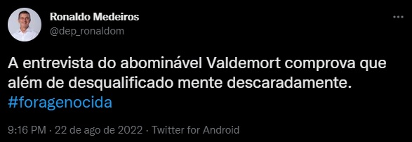 O deputado estadual Ronaldo Medeiros (PT) comparou o presidente ao vilão Voldemort, da saga de filmes Harry Potter, e afirmou que, “além de desqualificado mente descaradamente”.