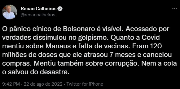 Renan Calheiros (MDB) disse que “o pânico cínico de Bolsonaro é visível. Acossado por verdades dissimulou no golpismo. Quanto à Covid mentiu sobre Manaus e falta de vacinas”.