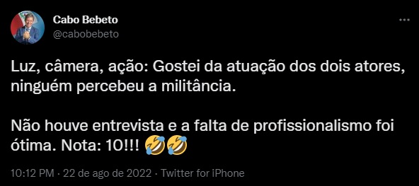 O deputado estadual Cabo Bebeto (PL) brincou: “Gostei da atuação dos dois atores, ninguém percebeu a militância. Não houve entrevista e a falta de profissionalismo foi ótima. Nota: 10”.