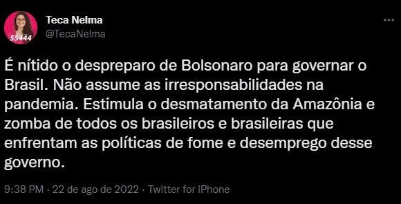 A vereadora por Maceió Teca Nelma (PSD) apontou que é “nítido o despreparo de Bolsonaro para governar o Brasil” e destacou que ele “não assume as irresponsabilidades [cometidas] na pandemia”.