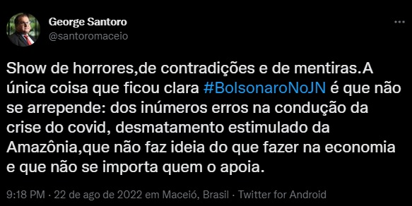 A entrevista de Bolsonaro ao Jornal Nacional, realizada na noite desta segunda-feira (22), repercutiu entre políticos alagoanos nas redes sociais.