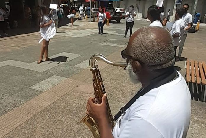 Juntamos cerca de 20 pessoas, representantes da Família de Anjos,portando cartazes, camisetas, ao som do sax do cantor Jairo Queiróz.