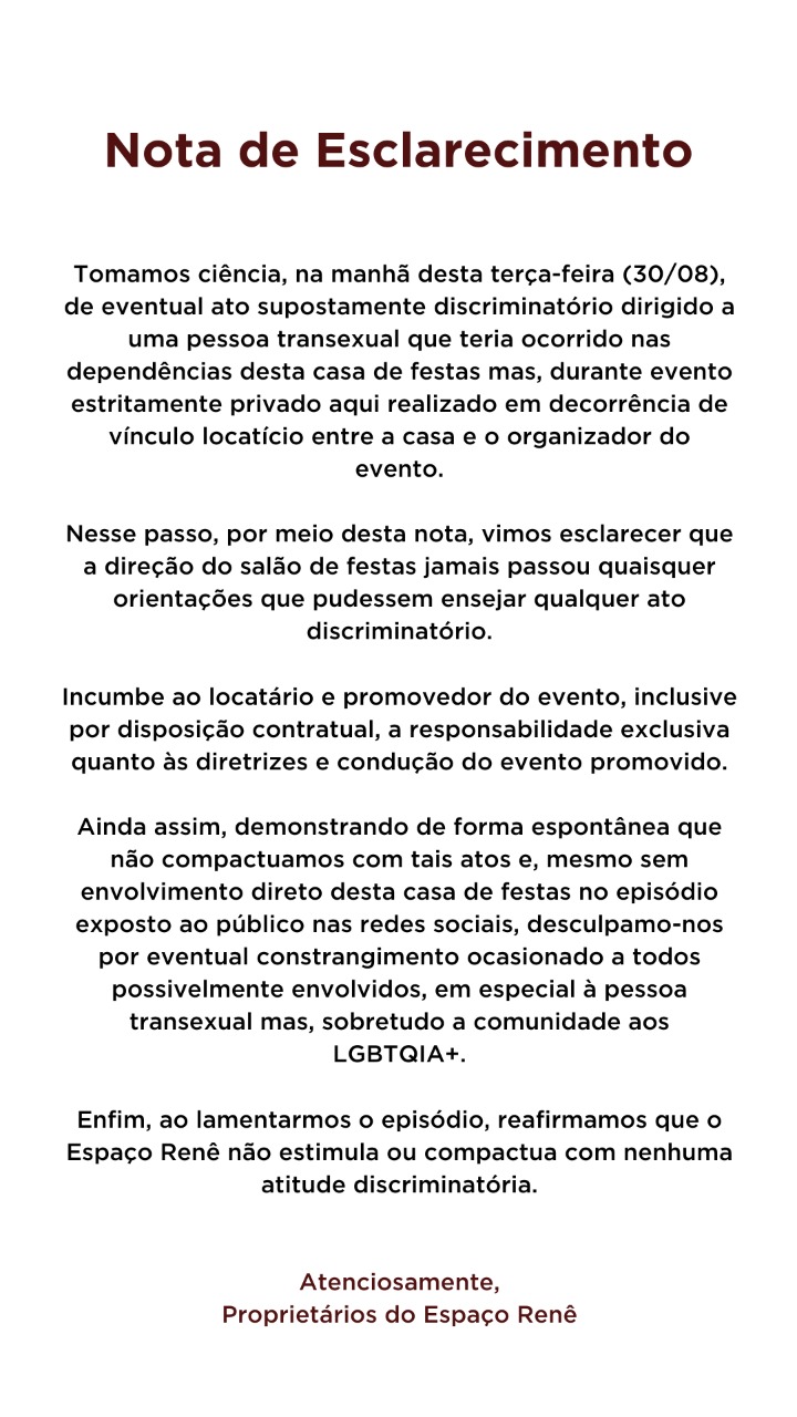 O Cada Minuto entrou em contato com o estabelecimento que lamentou o ocorrido e disse que a direção “jamais passou quaisquer orientações que pudessem ensejar qualquer ato discriminatório”.