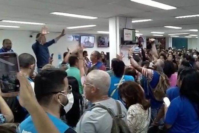 Antes de deixar o prédio da Semec, na noite desta terça (6), os agentes se reuniram em assembleia.