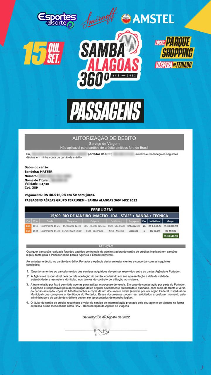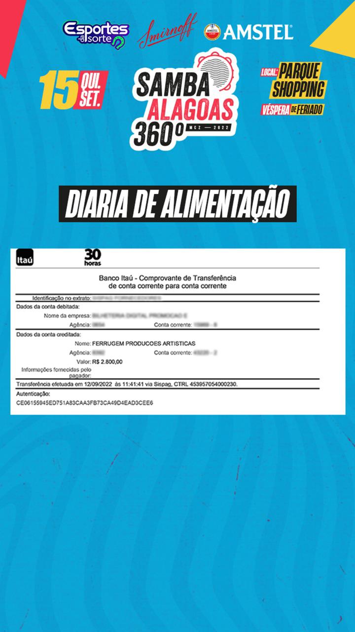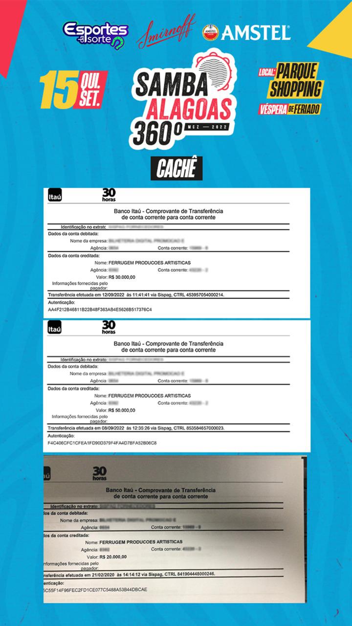 A organização do Samba Alagoas 360º também destaca que todos os compromissos assumidos pelas produtoras foram honrados pontualmente, a exemplo do pagamento integral do cachê e das diárias de alimentação e hospedagens e da aquisição das passagens aéreas, mostrando a sua responsabilidade diante do contrato assinado.