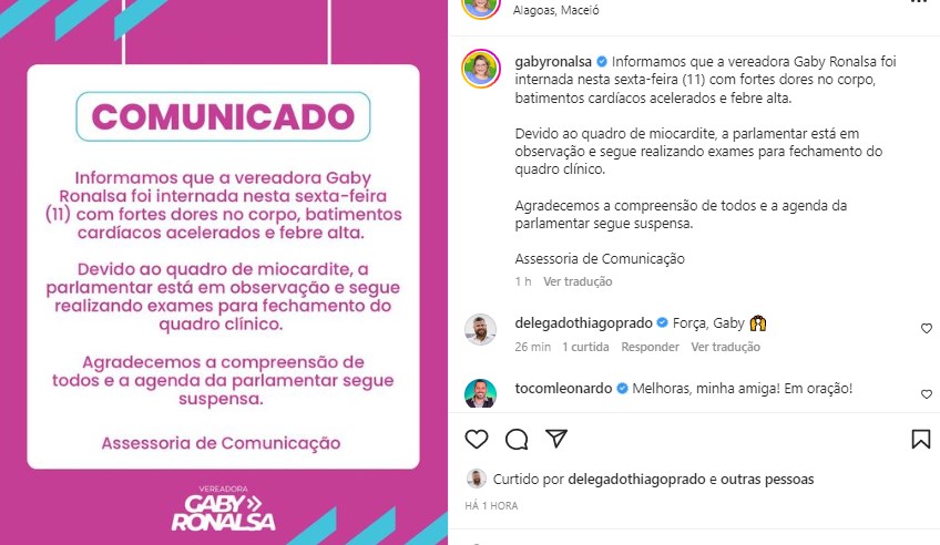 A assessoria informou ainda que a agenda da vereadora segue suspensa. Amigos e colegas da vereadora desejam melhoras e boa recuperação para ela, nos comentários do post, no Instagram.
