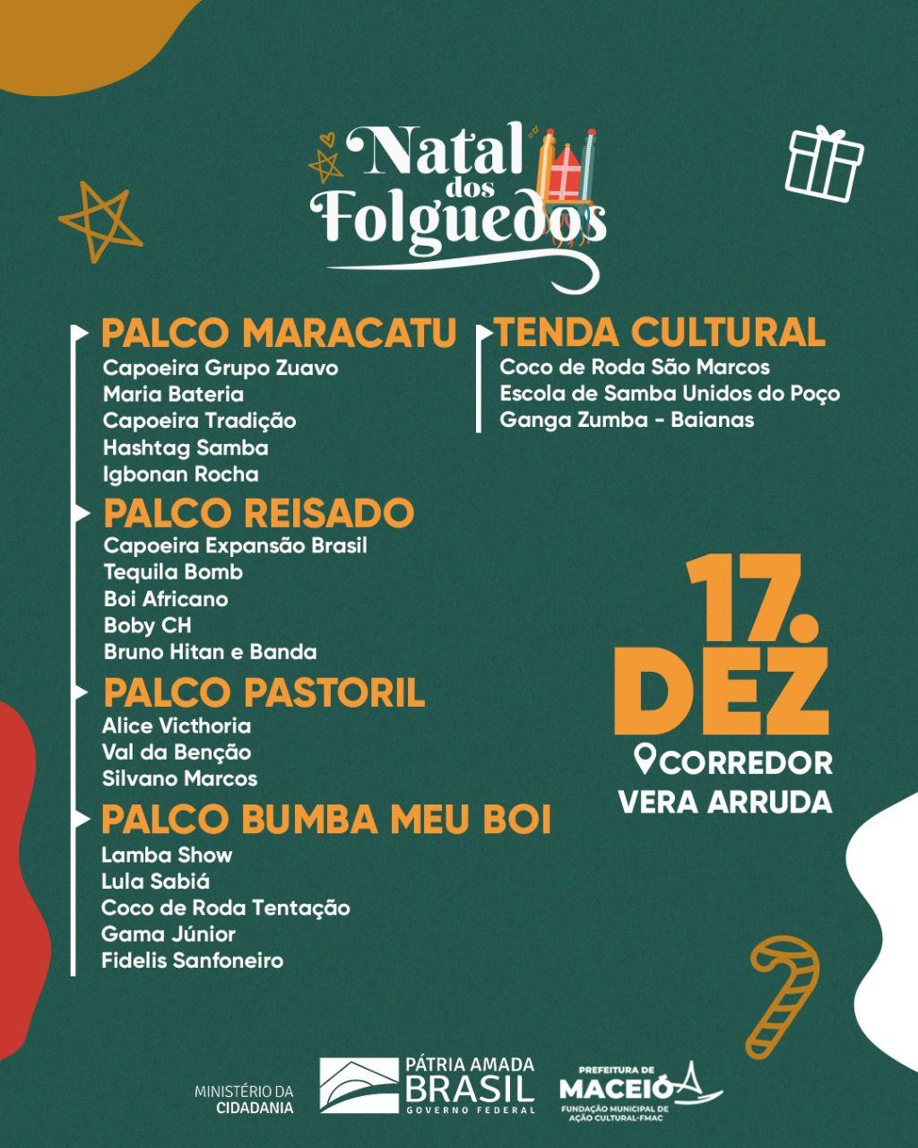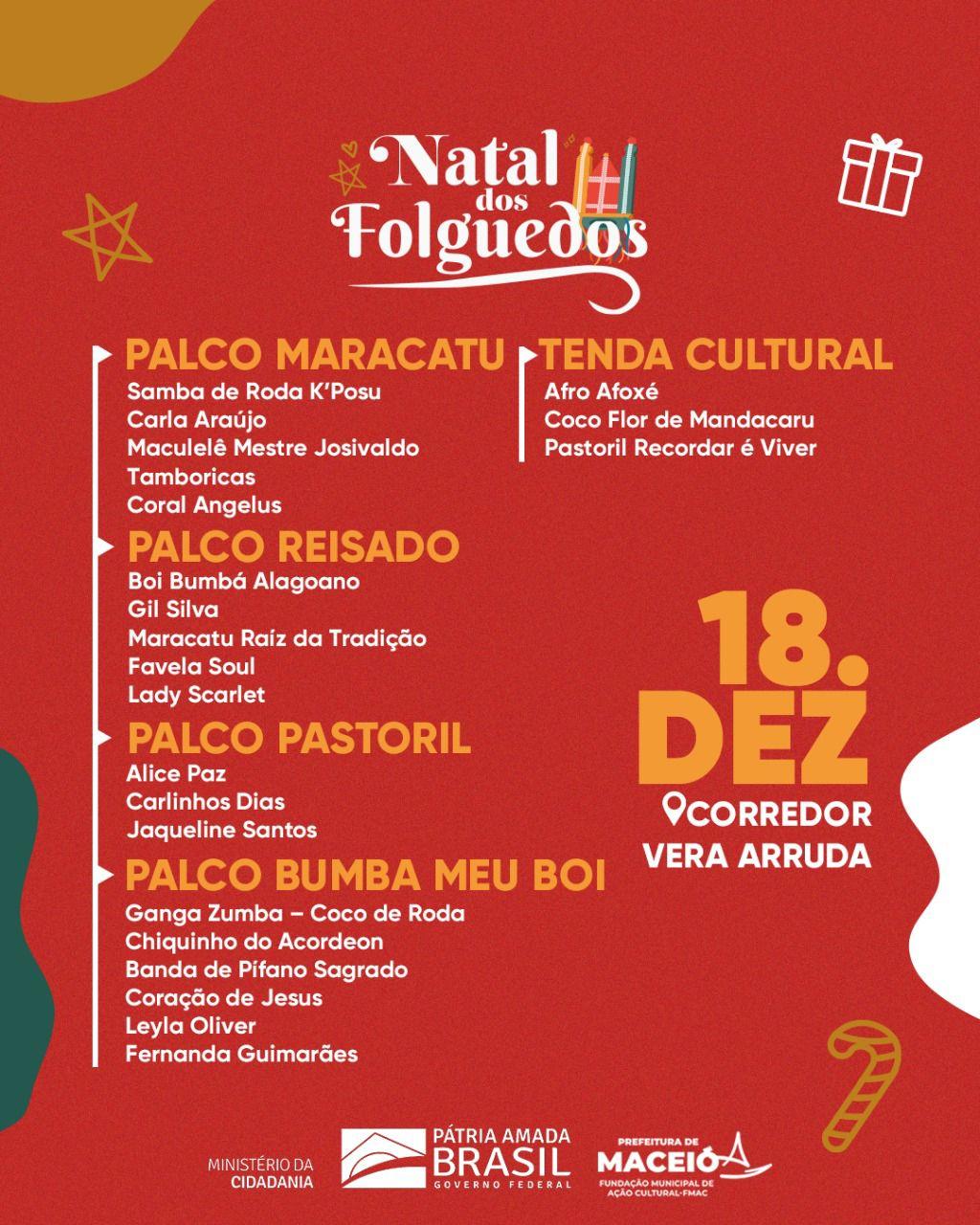 Pastoris, bois de Natal, reisados, cocos de roda, guerreiros e atrações musicais locais, do samba ao gospel, convidam a população e os turistas ao encontro com suas tradições nas ruas.