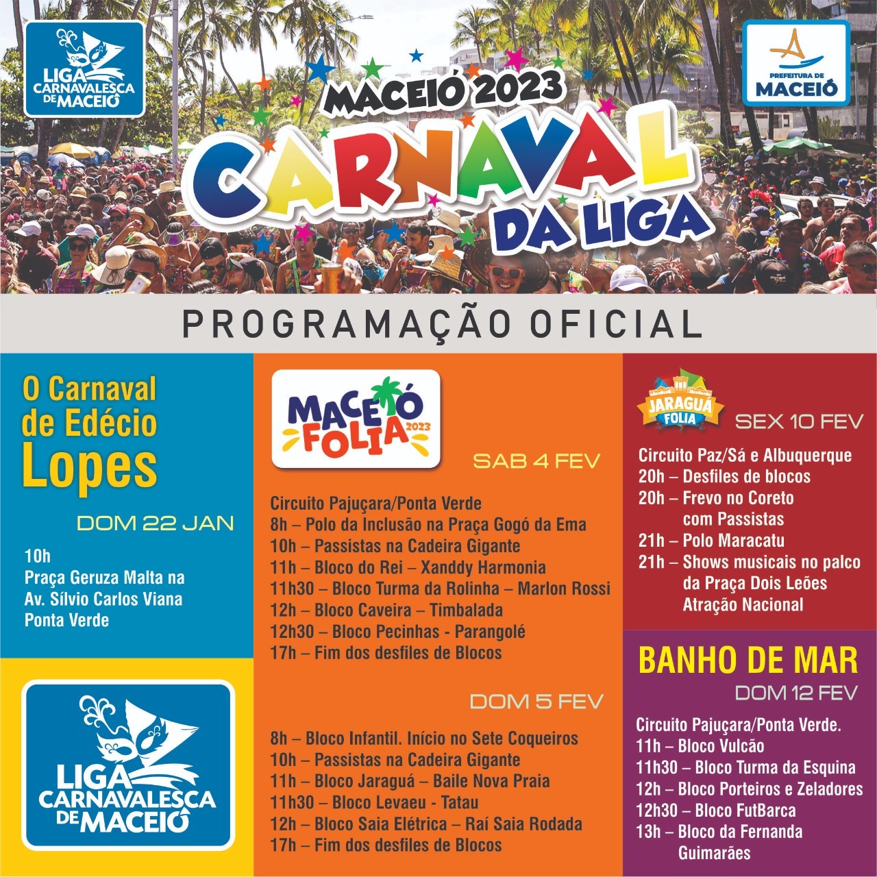 No domingo, 05, a alegria começa às 8h, nos Sete Coqueiros, com o Bloco Infantil, Passistas, Bloco Jaraguá, Bloco LevaEu, Saia Elétrica entre outros.
