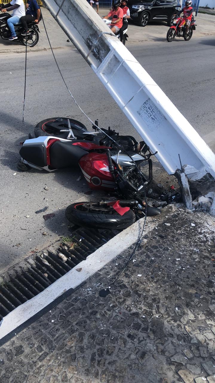 Uma colisão entre um carro e uma moto derrubou um poste, na manhã deste sábado (07), na Avenida Comendador Gustavo Paiva, no bairro Mangabeiras, em Maceió. O trânsito na região ficou lento após o acidente.