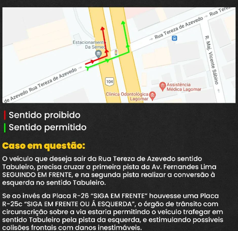 O veículo que deseja sair da Rua Tereza de Azevedo sentido Tabuleiro, precisa cruzar a primeira pista da Av. Fernandes Lima SEGUINDO EM FRENTE, e na segunda pista realizar a conversão à esquerda no sentido Tabuleiro do Martins.
