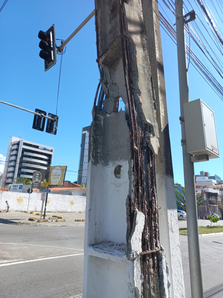 Nas imagens, é possível ver diversas rachaduras no concreto da estrutura e a base metálica do poste aparecendo.