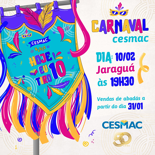 A festa que já tem a marca da família Cesmac, garantindo total segurança e tranquilidade. Com isso, consolida a participação da Instituição na principal prévia carnavalesca de Alagoas. A animação será por conta de Trio Elétrico e ainda Orquestra Pega Fogo, do município de Santa Luzia do Norte. Os abadás podem ser adquiridos no setor de Gestão com Pessoas, com valor unitário de 15 reais.