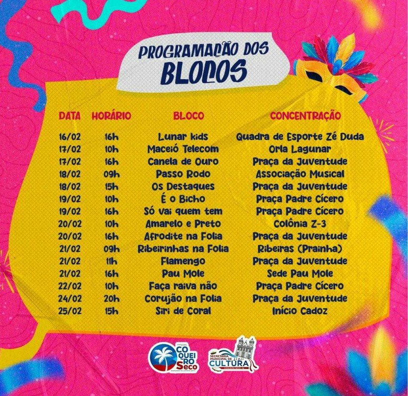 Ao todo serão 15 blocos, em 9 dias de folia. Ah... e se por algum motivo não tiver como ir nos dias de folia, Coqueiro tem a melhor ressaca do carnaval de Alagoas. No dia 25, com o arrastão do Bloco Siri de Coral, no povoado Cadoz, margeando a lagoa Mundau..