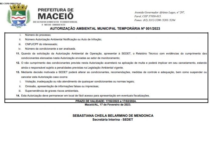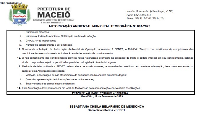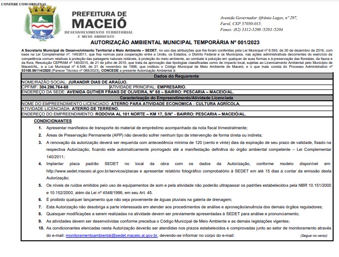 Em nota enviada ao CadaMinuto, a defesa do homem responsável pelo terreno informou que ele possui licença ambiental, mas que o mesmo foi acusado injustamente de falsificá-la. Conforme documento enviado à redação, o proprietário tem Licença Municipal Ambiental Temporária, concedida pela própria Prefeitura de Maceió; confira abaixo: