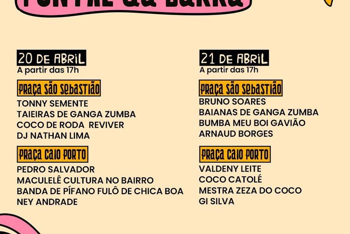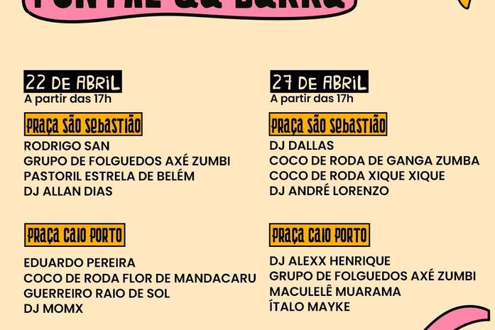 Começa, nesta quinta-feira (6), a segunda edição do Festival Abril Pra Cultura, a partir das 17h, nas praças São Sebastião e Caio Porto. No Jaraguá, o evento contará com quatro palcos descentralizados na região, ao longo da Rua Sá e Albuquerque.