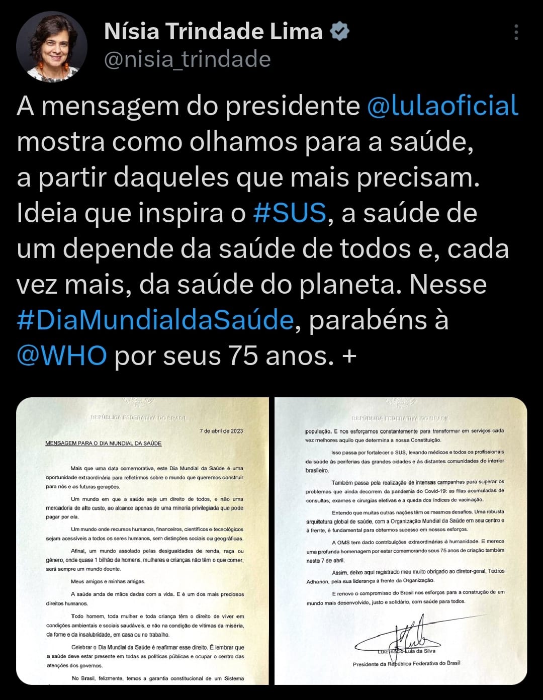 Em rede social, a ministra da Saúde, Nísia Trindade, comentou a mensagem do presidente Lula e ressaltou que a saúde de um depende da saúde de todos.