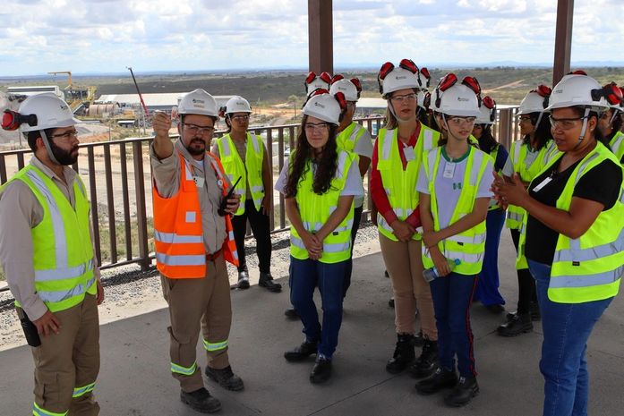 Depois de premiadas, acompanhadas das gestoras e professoras da escola, elas conheceram de perto a MVV, indo até o totem instagramável no platô da Britagem, com uma vista panorâmica da Mina Serrote.