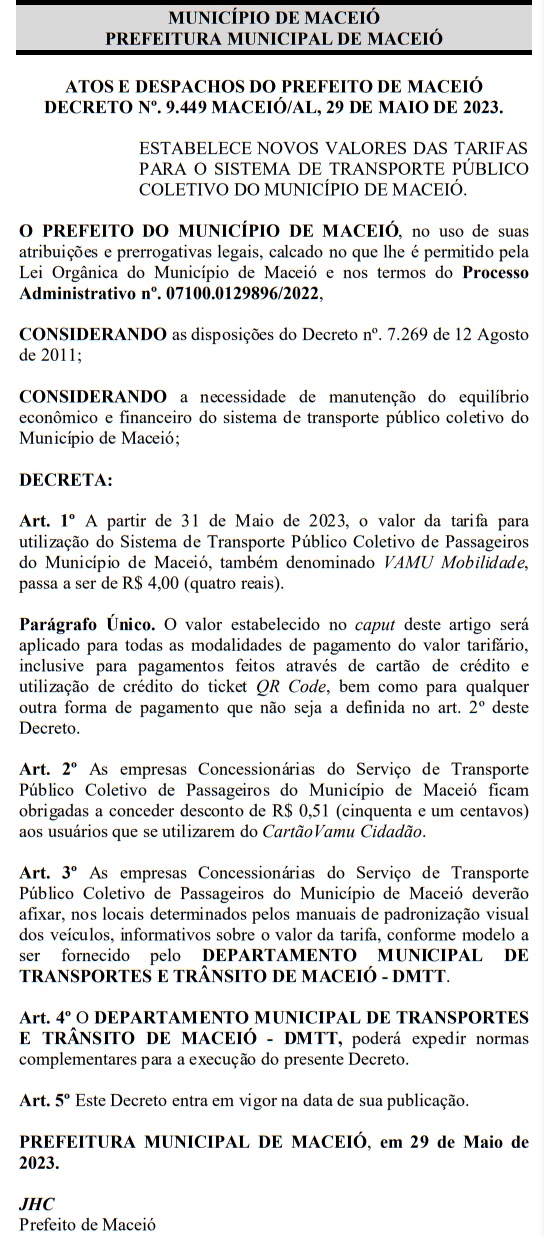 Desta forma, valor da tarifa para utilização do Sistema de Transporte Público Coletivo de Passageiros do Município de Maceió, também denominado VAMU Mobilidade, passa a ser de R$ 4,00.