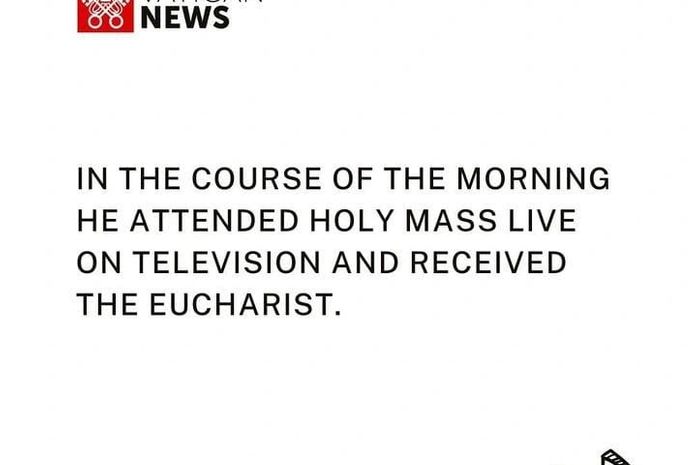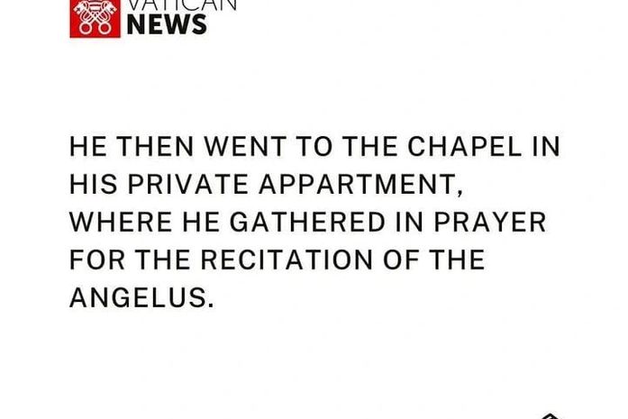 Segundo informações, durante a manhã o Pontífice acompanhou a Santa Missa ao vivo pela televisão e recebeu a Eucaristia. Após esse momento, ele dirigiu–se à pequena capela do apartamento privado, onde se recolheu em oração para a recitação do Angelus.