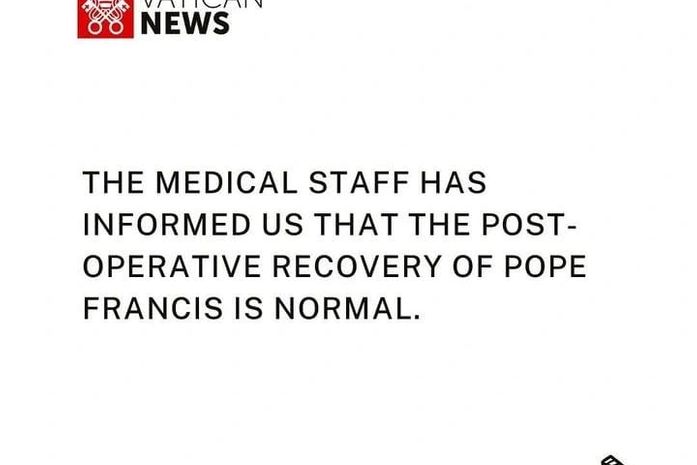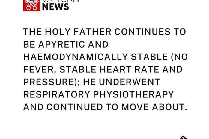 O Vaticano divulgou, em nota, na manhã deste domingo (11), que o Papa Francisco passou por uma sessão de fisioterapia respiratória, mas que o pós-operatório continua regular. De acordo com a equipe médica, o Santo Padre continua sem febre e hemodinamicamente estável.