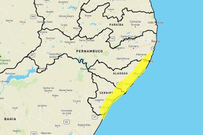 O Instituto Nacional de Meteorologia (Inmet) emitiu um novo alerta amarelo (de perigo potencial), na madrugada desta sexta-feira (16), de acumulado de chuvas para Maceió e mais 39 municípios de Alagoas. O aviso é válido até sábado (17), às 23h59.