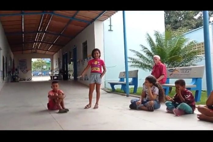Um dia após da participação da aluna na Omode, a Jô , como coordenadora, reuniu as crianças da pequena escola, por turnos, para que menina partilhasse sua experiência.