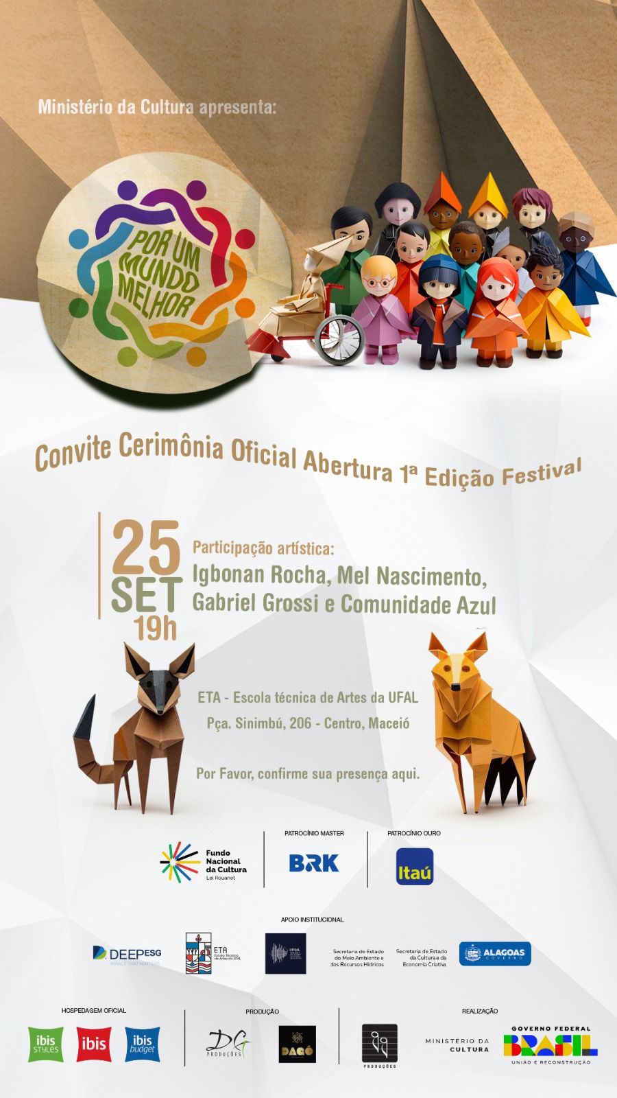 Esse Projeto é realizado através da Lei de Incentivo a Cultura com patrocínio BRK | ITAÚ com apoio Institucional de DEPP ESG, INSTITUTO ALANA , ETA – Escola técnica de Artes, Universidade Federal de Alagoas, DITEAL, Teatro Deodoro, Secretaria de Estada da Cultura e da Economia Criativa, Secretaria de Estado do Meio Ambiente e dos Recursos Hídricos e Governo de Alagoas. Com hospedagem oficial dos hotéis IBIS, IBIS Styles, IBIS Budget produção de Dagô Produções e DG Produções com a realização de GG Produções e Ministério da Cultura, Governo federal | União e Reconstrução.