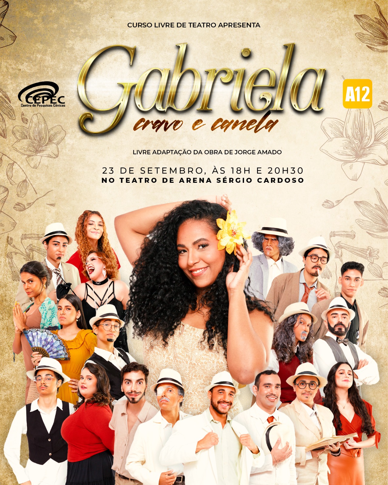 Um clássico da literatura brasileira, ‘Gabriela – cravo e canela’, de Jorge Amado, ganhou uma adaptação e se transformou em um espetáculo do Centro De Pesquisas Cênicas (CEPEC). A peça será encenada neste sábado (23), em duas sessões, às 18h e às 20h30, no Teatro de Arena Sérgio Cardoso, anexo ao Teatro Deodoro, em Maceió. Os ingressos custam R$ 25,00 (meia) e R$ 50,00 (inteira) e estão sendo vendidos na plataforma Sympla.