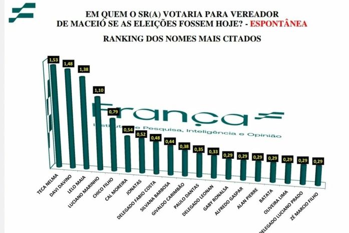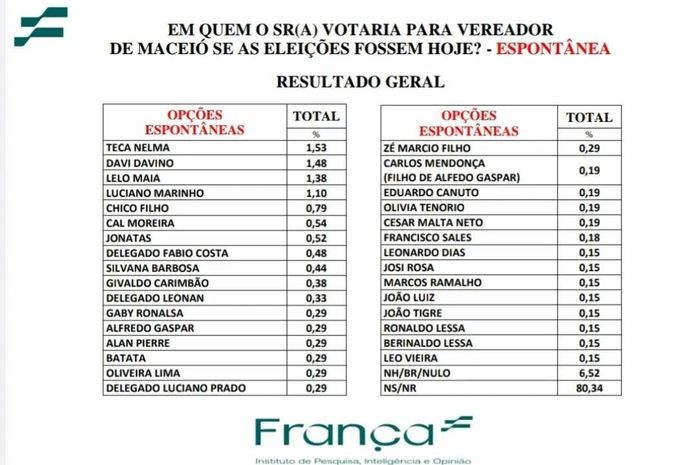 O França Pesquisa, Inteligência e Opinião é um instituto de Sergipe. O levantamento foi divulgado nesta segunda-feira (30) e apresenta as intenções de voto para a Prefeitura de Maceió e para a Câmara da capital alagoana. Mais de 800 pessoas foram entrevistadas, sendo 44,4% do sexo masculino e 55,7% do sexo feminino. A maioria dos entrevistados estava na faixa etária de 45 e 59 anos.