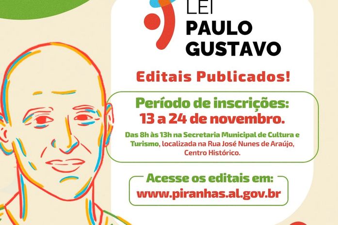 A prefeitura de Piranhas, através da Secretaria de Cultura e Turismo, informa que estão abertas as inscrições para a Lei Paulo Gustavo LPG, até o dia 24 de novembro, e torna público os editais direcionados a Área Audiovisual e as demais Culturas.⠀⠀