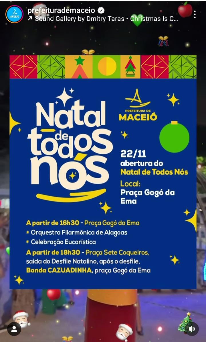 A Prefeitura de Maceió divulgou, na noite desta segunda-feira (20), a data da abertura do Natal de Todos Nós. Segundo a gestão municipal, as festividades em comemoração ao Natal já começam nesta quarta-feira (22) na capital alagoana.
